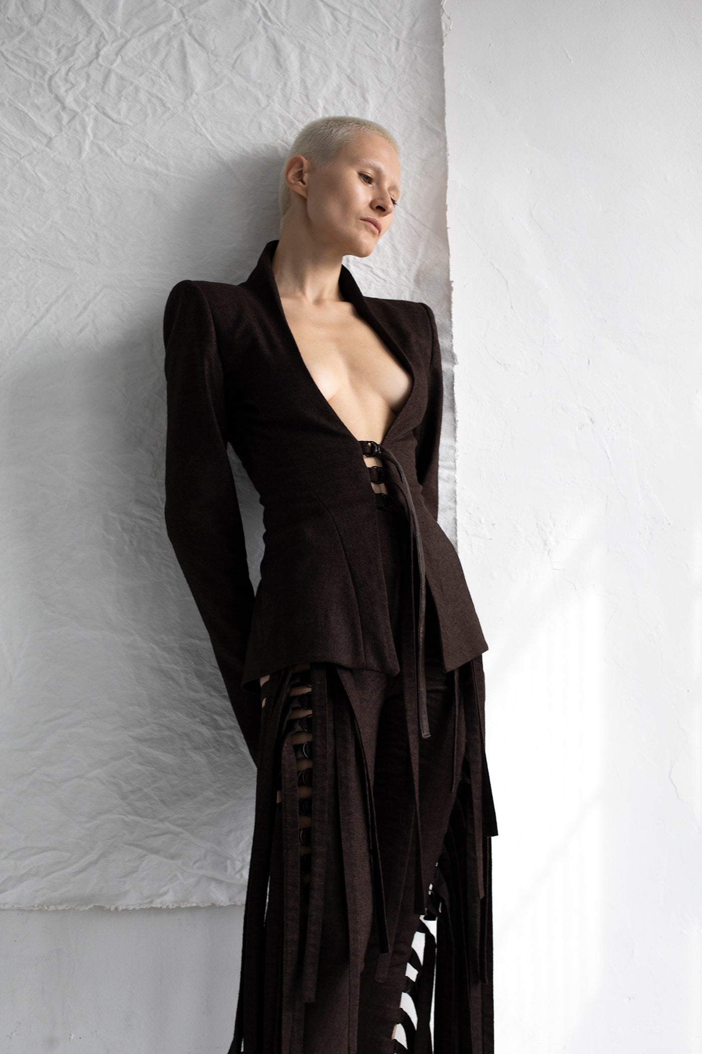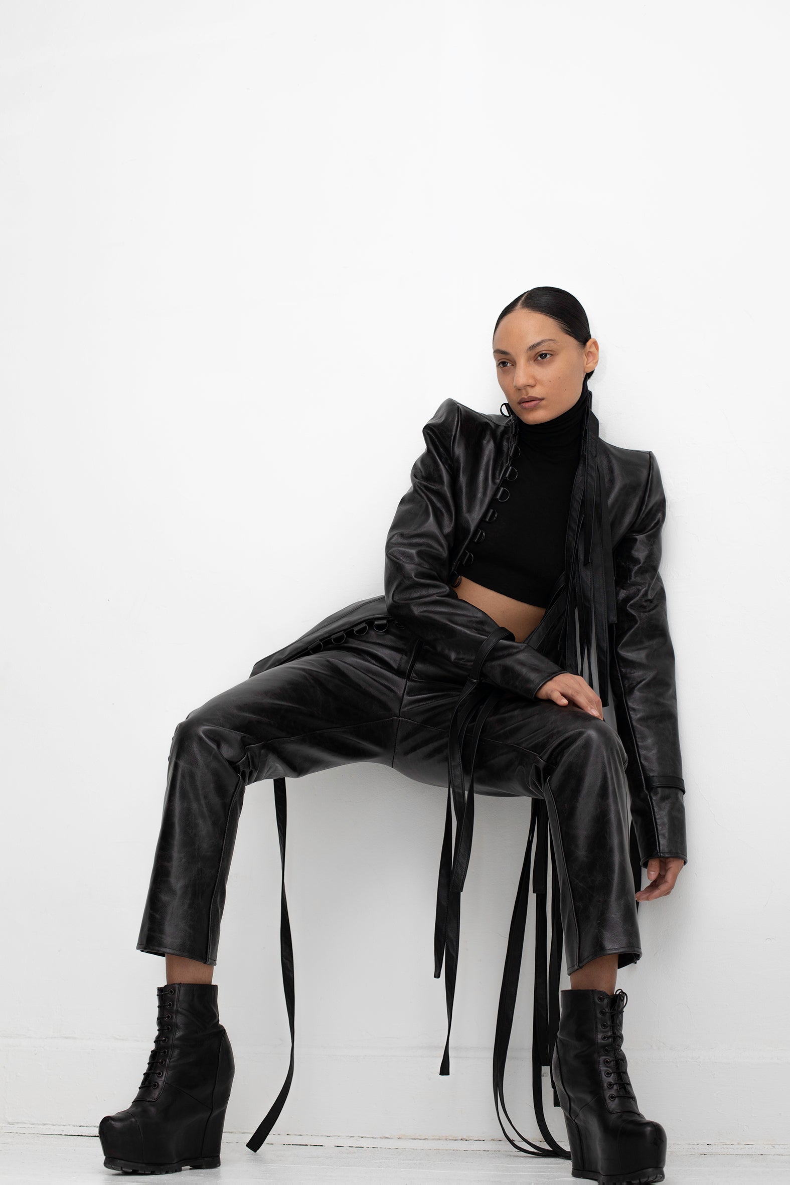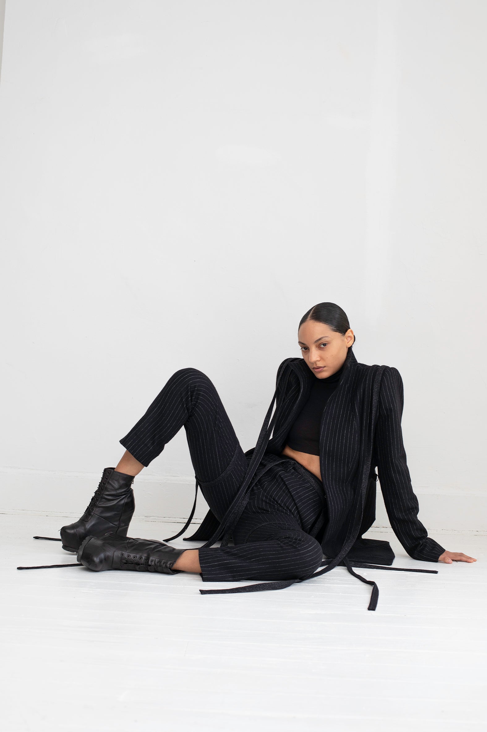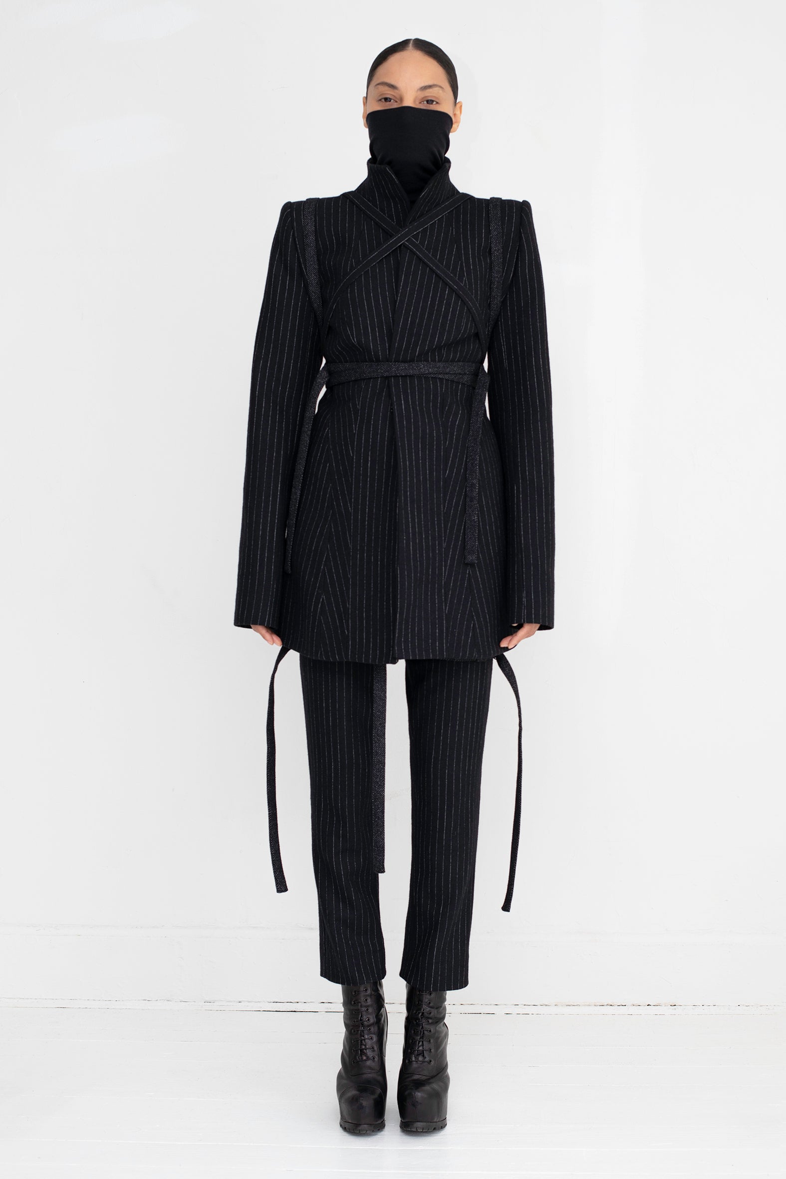 Eleen Halvorsen's first installment of CONCEPT X is a collection of garments born from a year in quarantine, inspired by the need for dressing for one’s own pleasure. Looking at dressing as ritual, this is a collection in which fetish aesthetics meets sharp, minimal tailoring, focusing on straps and harness details as a means to empower - not tie down. Intrigued by the idea of creating a collection of garments with intricate closures that would give the wearer an experience every time they put them on, utilizing a multitude of straps to fetishize the otherwise automatic concept of putting on a pair of pants or a dress. I wanted the juxtaposition of feeling tied in, but at the same time exposed. Hence the name of the garments: The Exhibitionist Coat, Exhbitionist Pants etc. All made from materials sourced locally in the NYC garment district. All the straps are measured, cut, pressed and assembled individually in-house, a laborious process which again ties into the idea of fetishizing the garment all the way from making - to dressing by the wearer. Tailoring meets bondage, for the pure love of beautifully constructed garments and dark aesthetics.