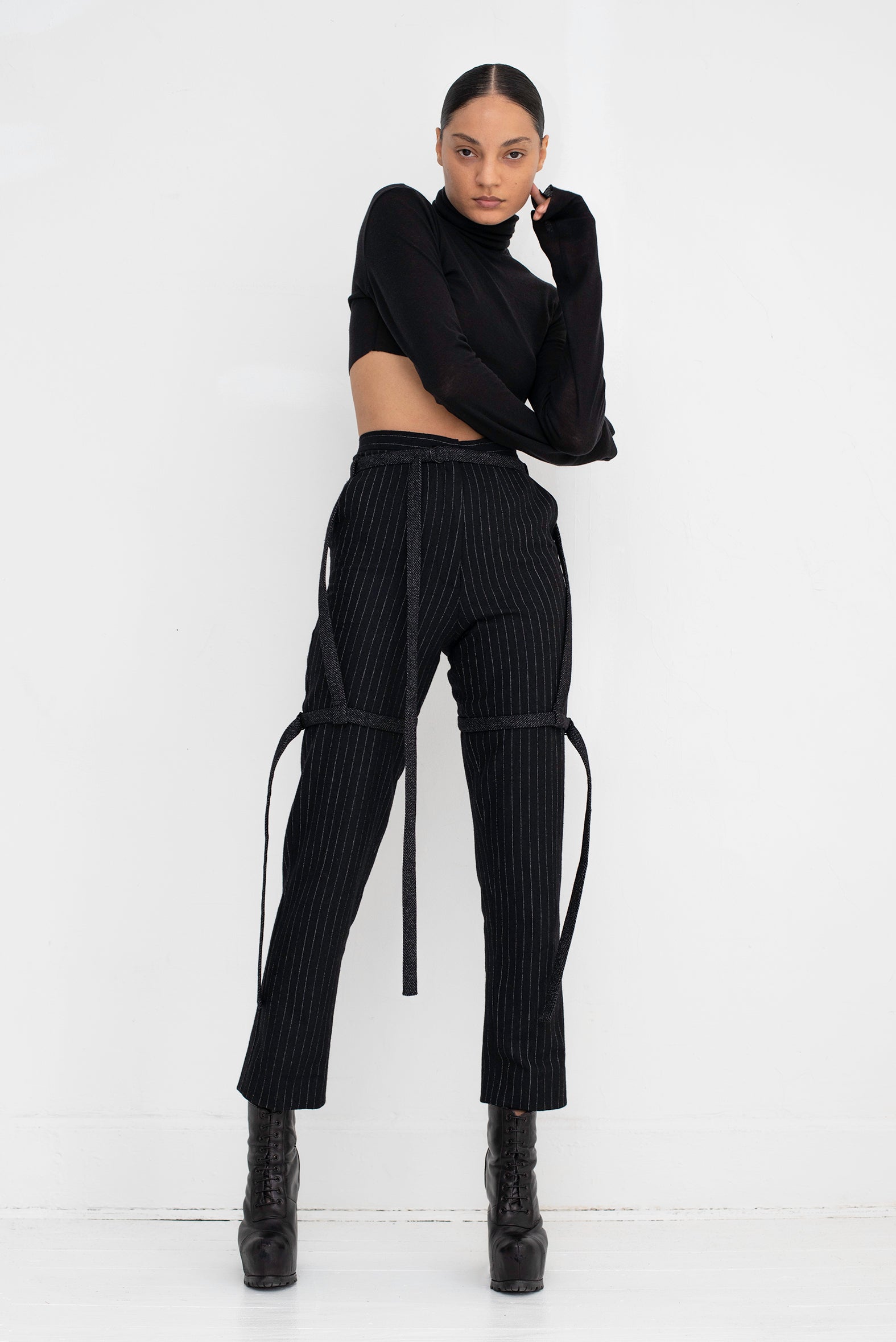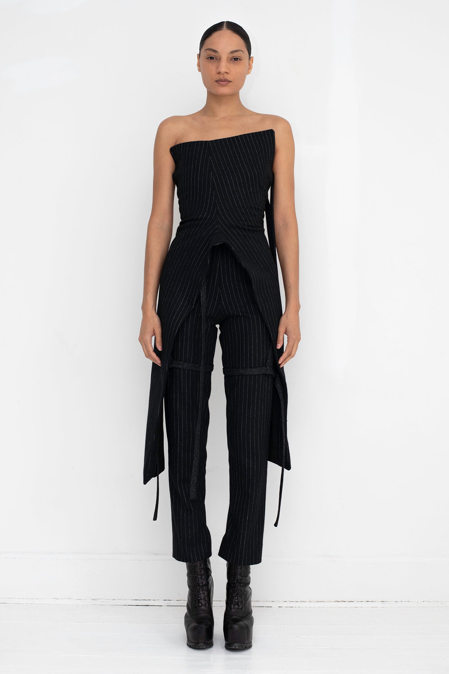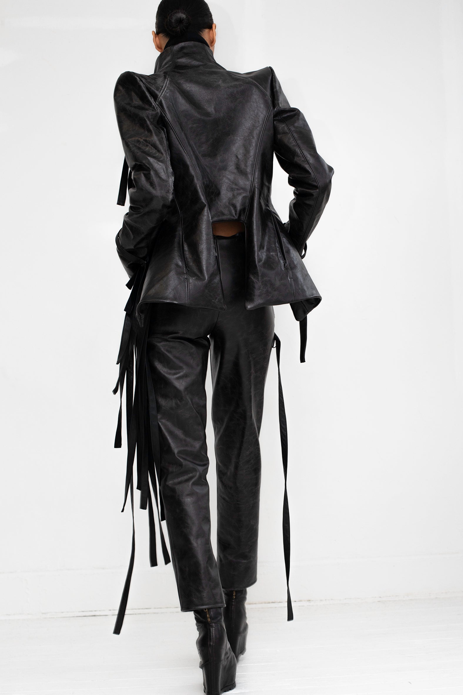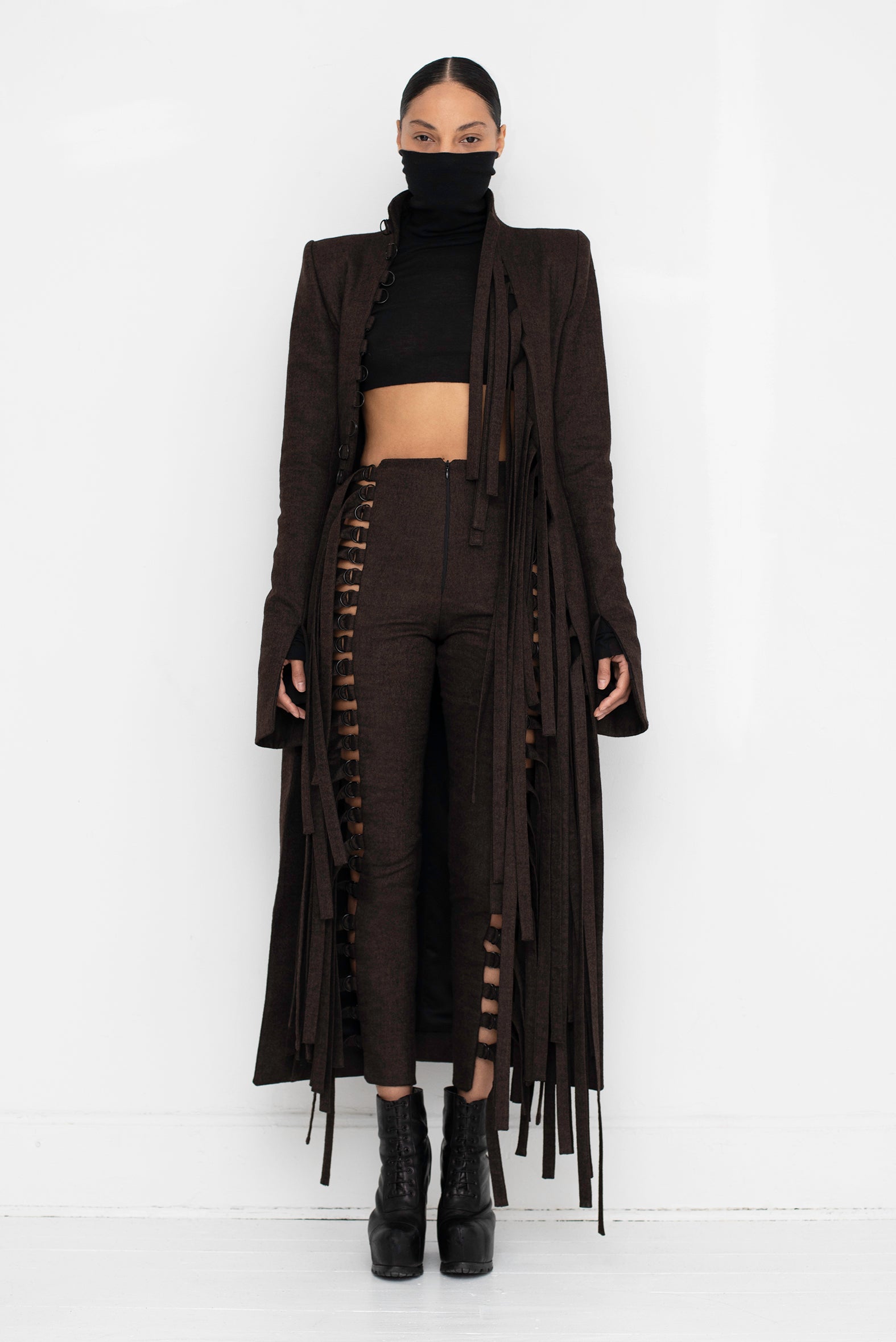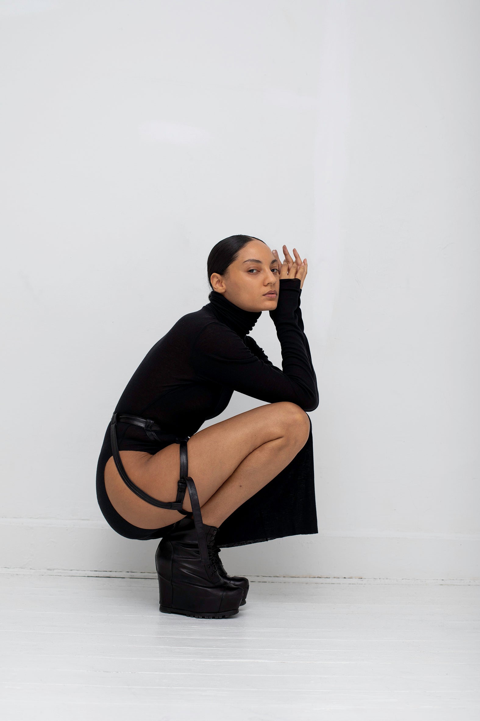 Eleen Halvorsen's first installment of CONCEPT X is a collection of garments born from a year in quarantine, inspired by the need for dressing for one’s own pleasure. Looking at dressing as ritual, this is a collection in which fetish aesthetics meets sharp, minimal tailoring, focusing on straps and harness details as a means to empower - not tie down. Intrigued by the idea of creating a collection of garments with intricate closures that would give the wearer an experience every time they put them on, utilizing a multitude of straps to fetishize the otherwise automatic concept of putting on a pair of pants or a dress. I wanted the juxtaposition of feeling tied in, but at the same time exposed. Hence the name of the garments: The Exhibitionist Coat, Exhbitionist Pants etc. All made from materials sourced locally in the NYC garment district. All the straps are measured, cut, pressed and assembled individually in-house, a laborious process which again ties into the idea of fetishizing the garment all the way from making - to dressing by the wearer. Tailoring meets bondage, for the pure love of beautifully constructed garments and dark aesthetics.