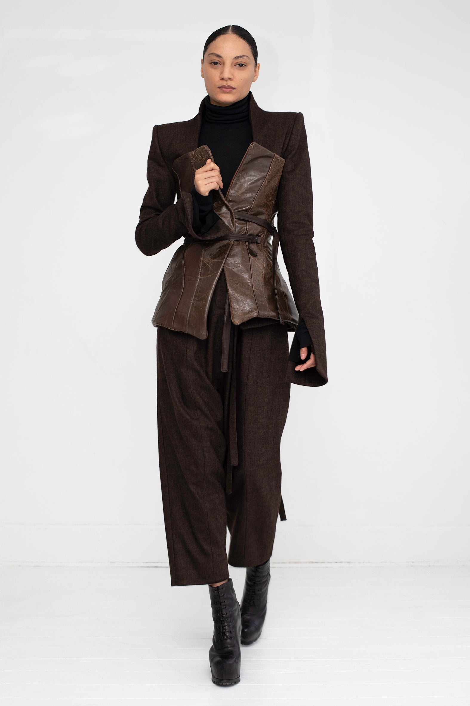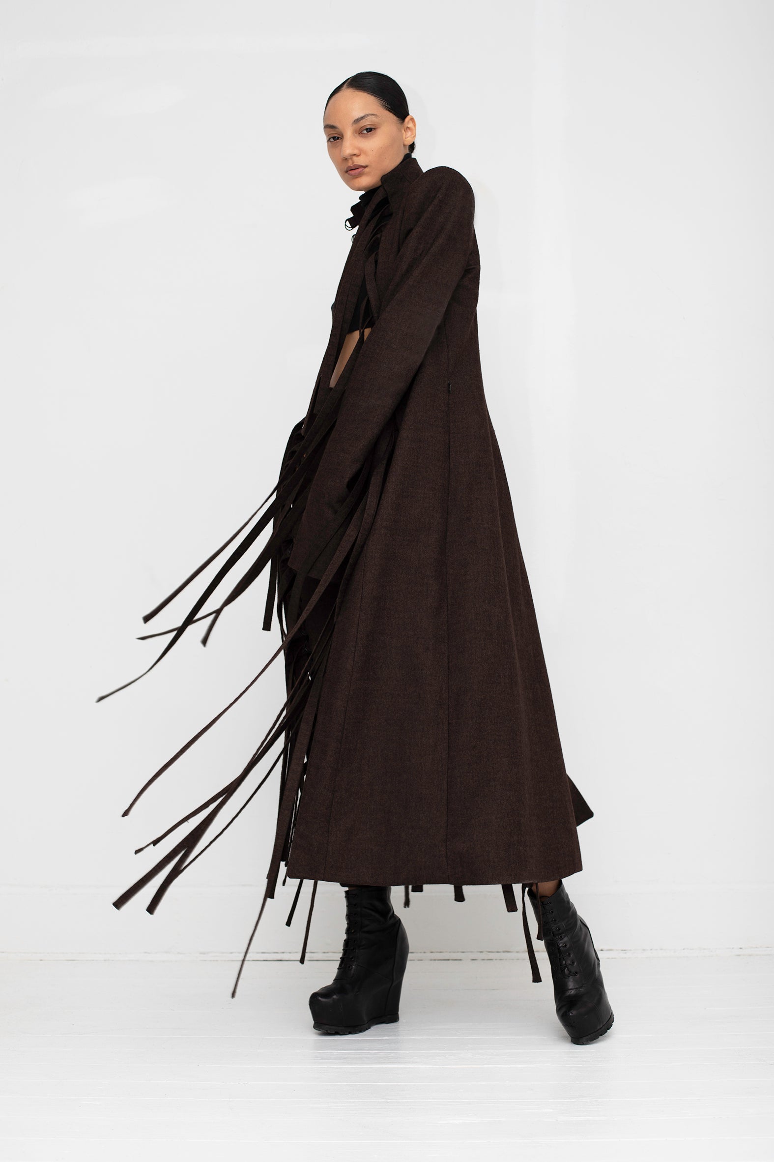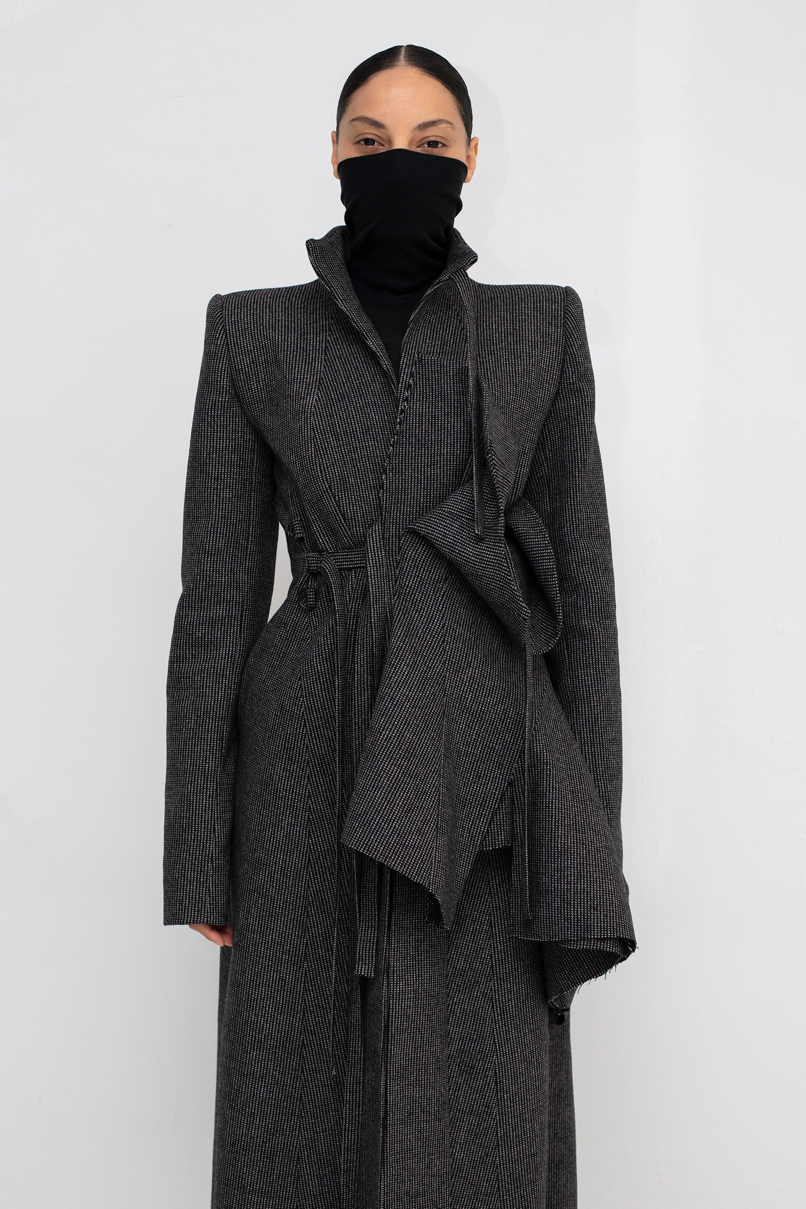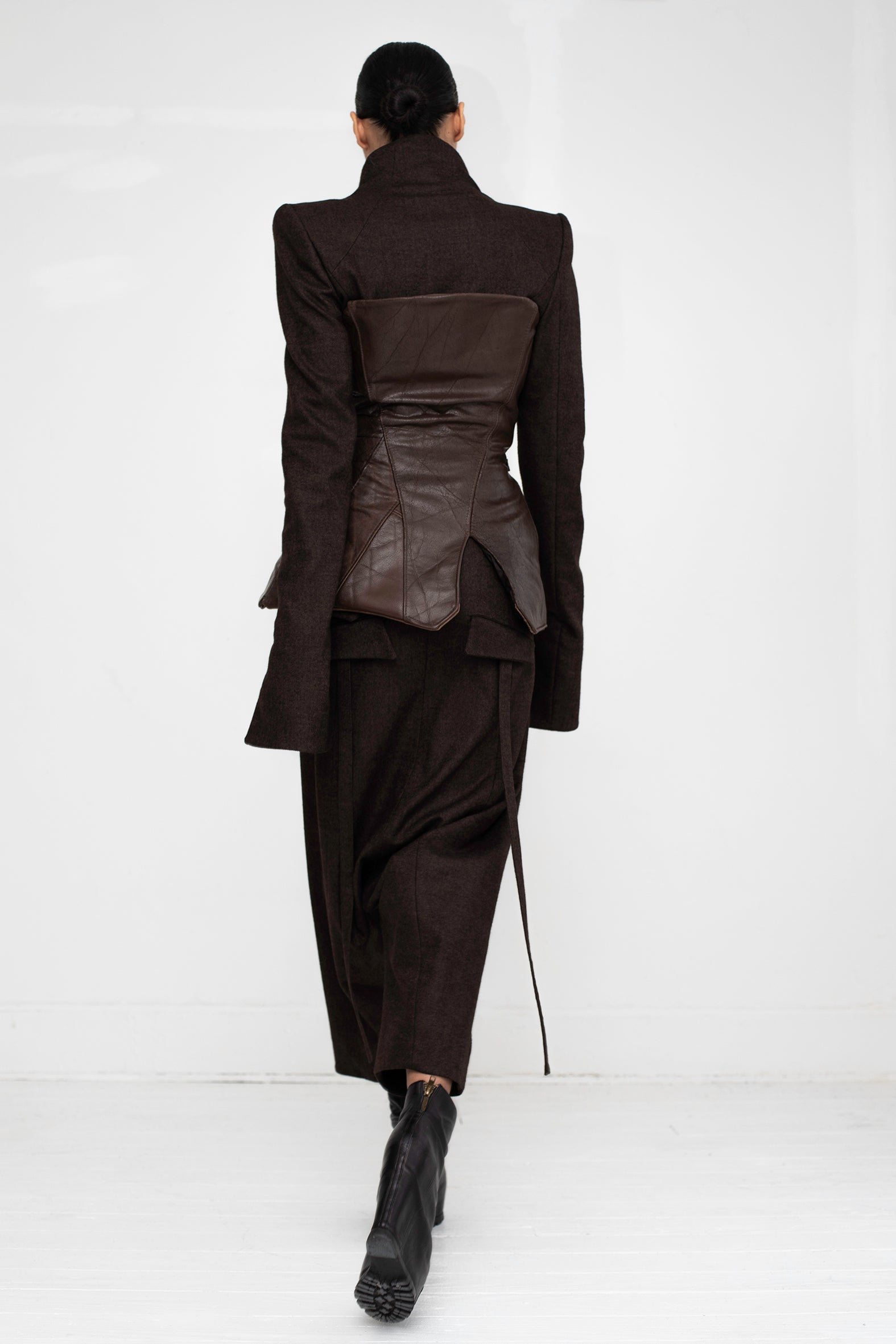 Eleen Halvorsen's first installment of CONCEPT X is a collection of garments born from a year in quarantine, inspired by the need for dressing for one’s own pleasure. Looking at dressing as ritual, this is a collection in which fetish aesthetics meets sharp, minimal tailoring, focusing on straps and harness details as a means to empower - not tie down. Intrigued by the idea of creating a collection of garments with intricate closures that would give the wearer an experience every time they put them on, utilizing a multitude of straps to fetishize the otherwise automatic concept of putting on a pair of pants or a dress. I wanted the juxtaposition of feeling tied in, but at the same time exposed. Hence the name of the garments: The Exhibitionist Coat, Exhbitionist Pants etc. All made from materials sourced locally in the NYC garment district. All the straps are measured, cut, pressed and assembled individually in-house, a laborious process which again ties into the idea of fetishizing the garment all the way from making - to dressing by the wearer. Tailoring meets bondage, for the pure love of beautifully constructed garments and dark aesthetics.