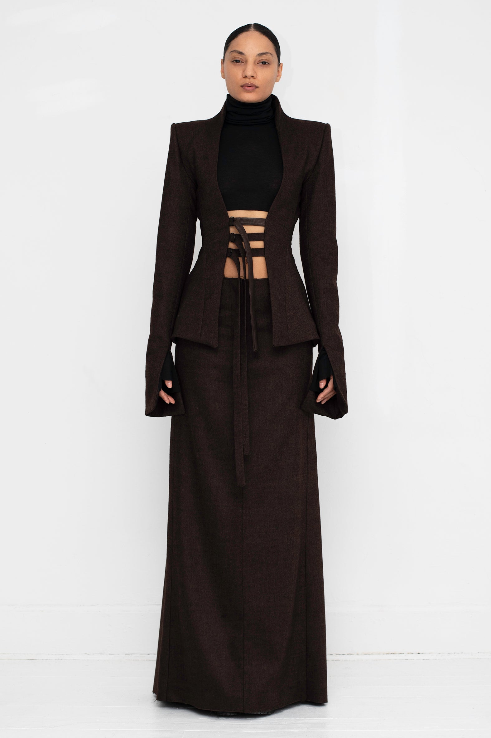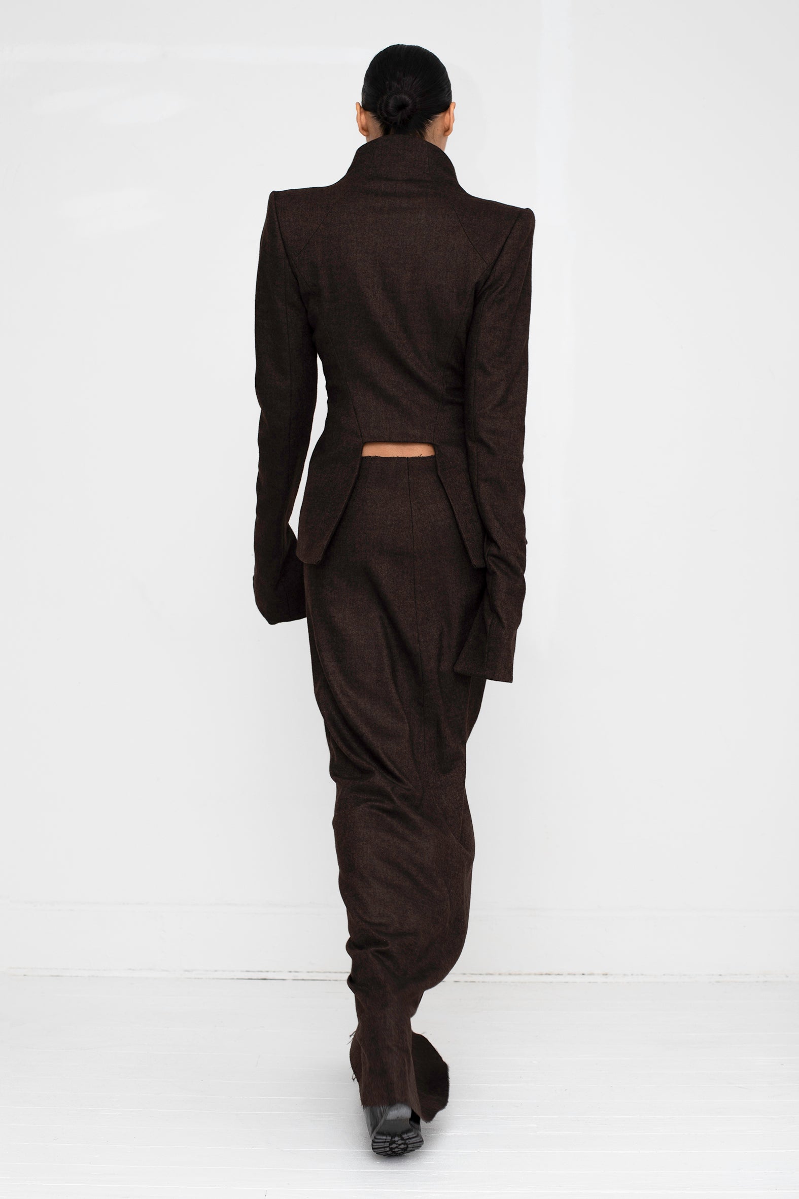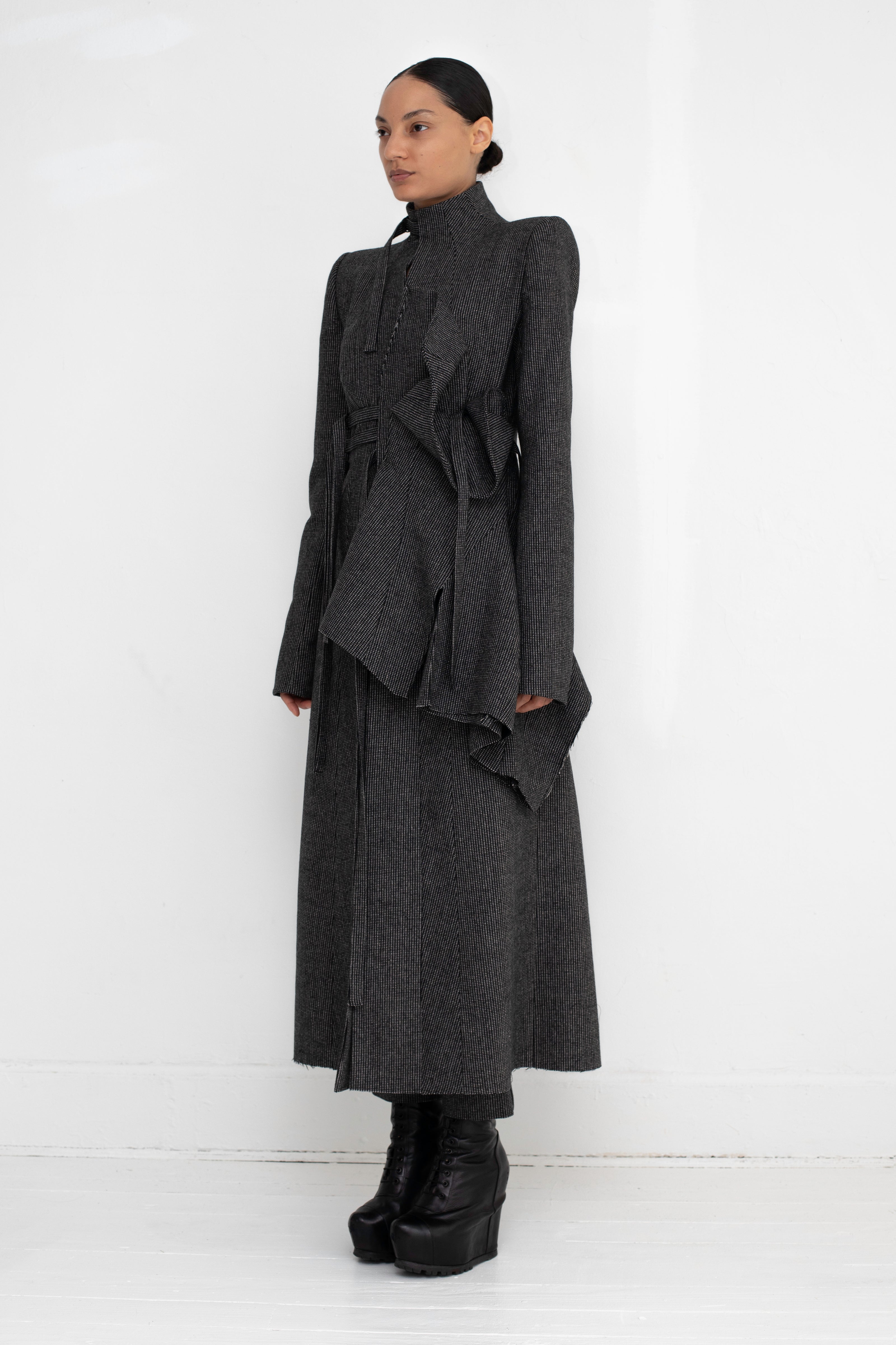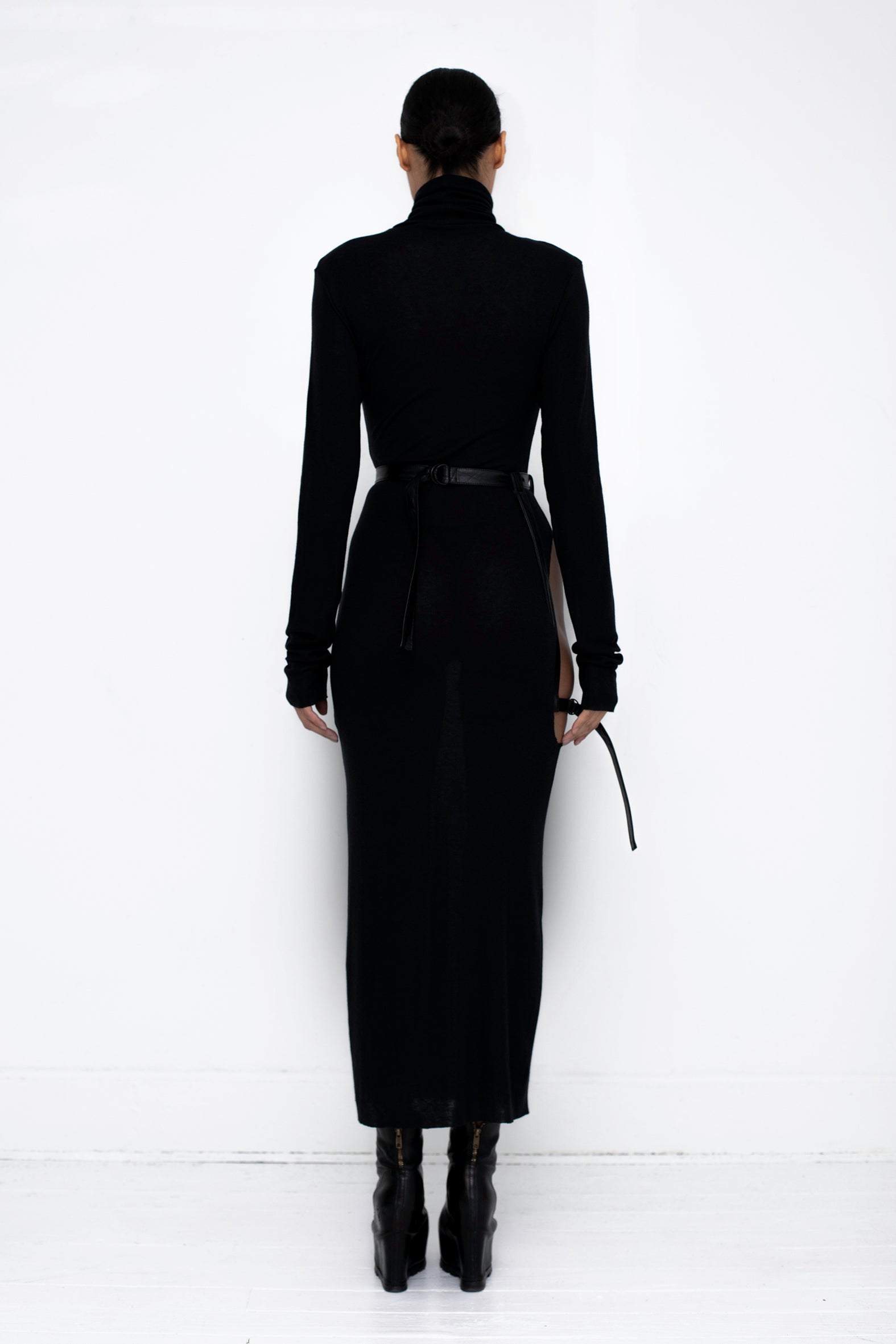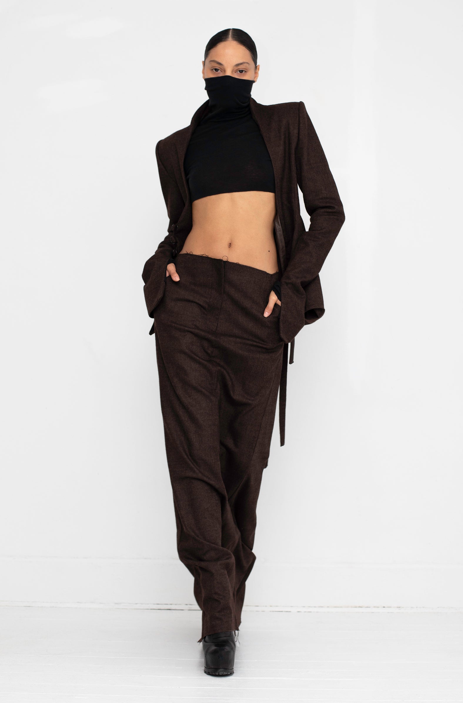 Eleen Halvorsen's first installment of CONCEPT X is a collection of garments born from a year in quarantine, inspired by the need for dressing for one’s own pleasure. Looking at dressing as ritual, this is a collection in which fetish aesthetics meets sharp, minimal tailoring, focusing on straps and harness details as a means to empower - not tie down. Intrigued by the idea of creating a collection of garments with intricate closures that would give the wearer an experience every time they put them on, utilizing a multitude of straps to fetishize the otherwise automatic concept of putting on a pair of pants or a dress. I wanted the juxtaposition of feeling tied in, but at the same time exposed. Hence the name of the garments: The Exhibitionist Coat, Exhbitionist Pants etc. All made from materials sourced locally in the NYC garment district. All the straps are measured, cut, pressed and assembled individually in-house, a laborious process which again ties into the idea of fetishizing the garment all the way from making - to dressing by the wearer. Tailoring meets bondage, for the pure love of beautifully constructed garments and dark aesthetics.