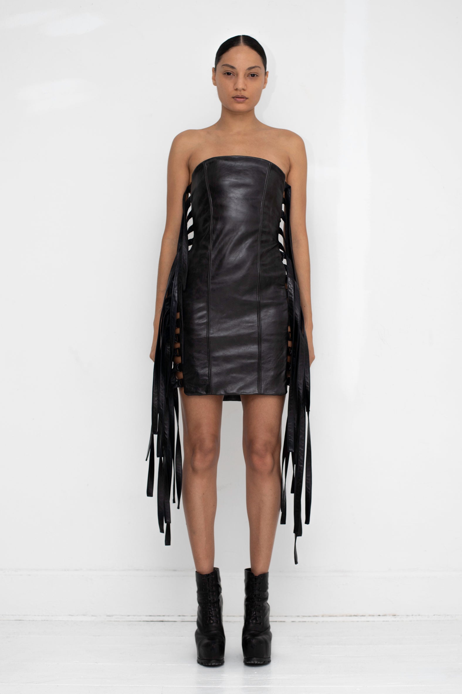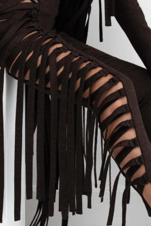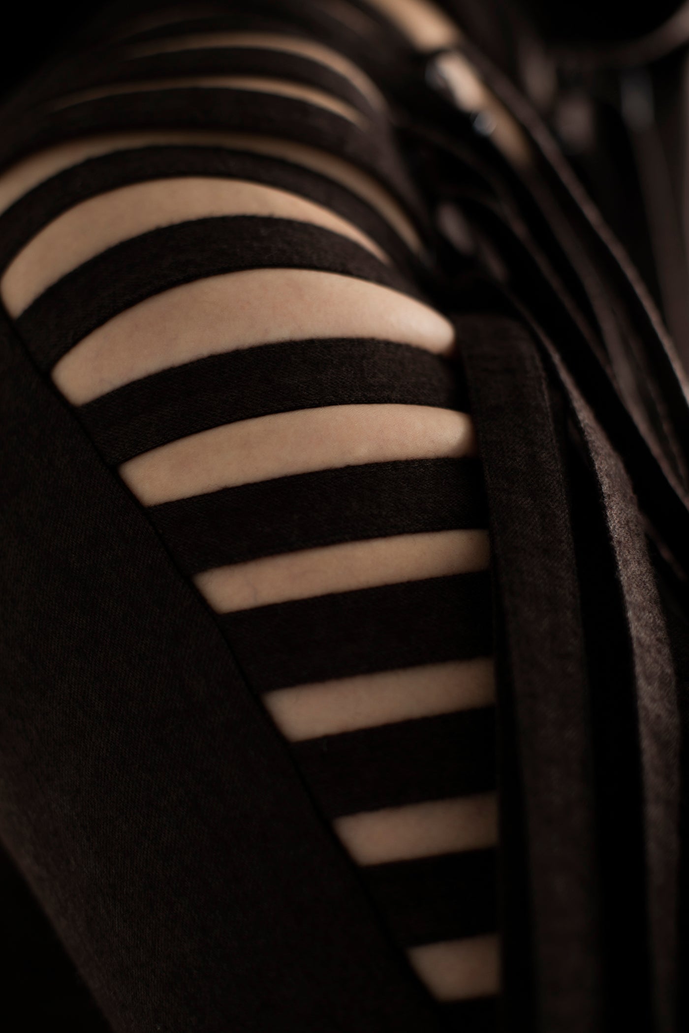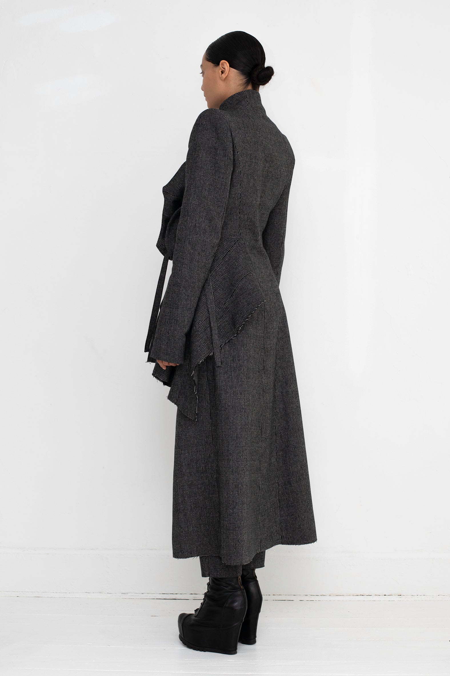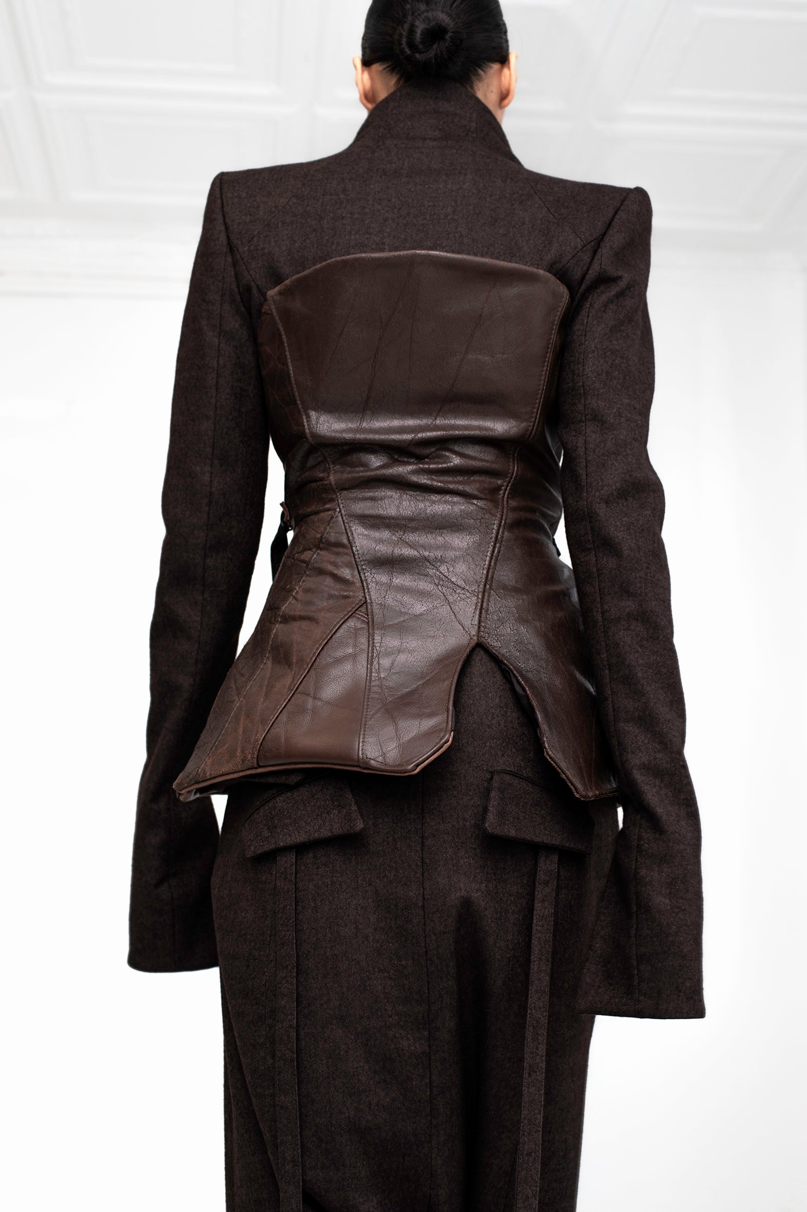 Eleen Halvorsen's first installment of CONCEPT X is a collection of garments born from a year in quarantine, inspired by the need for dressing for one’s own pleasure. Looking at dressing as ritual, this is a collection in which fetish aesthetics meets sharp, minimal tailoring, focusing on straps and harness details as a means to empower - not tie down. Intrigued by the idea of creating a collection of garments with intricate closures that would give the wearer an experience every time they put them on, utilizing a multitude of straps to fetishize the otherwise automatic concept of putting on a pair of pants or a dress. I wanted the juxtaposition of feeling tied in, but at the same time exposed. Hence the name of the garments: The Exhibitionist Coat, Exhbitionist Pants etc. All made from materials sourced locally in the NYC garment district. All the straps are measured, cut, pressed and assembled individually in-house, a laborious process which again ties into the idea of fetishizing the garment all the way from making - to dressing by the wearer. Tailoring meets bondage, for the pure love of beautifully constructed garments and dark aesthetics.