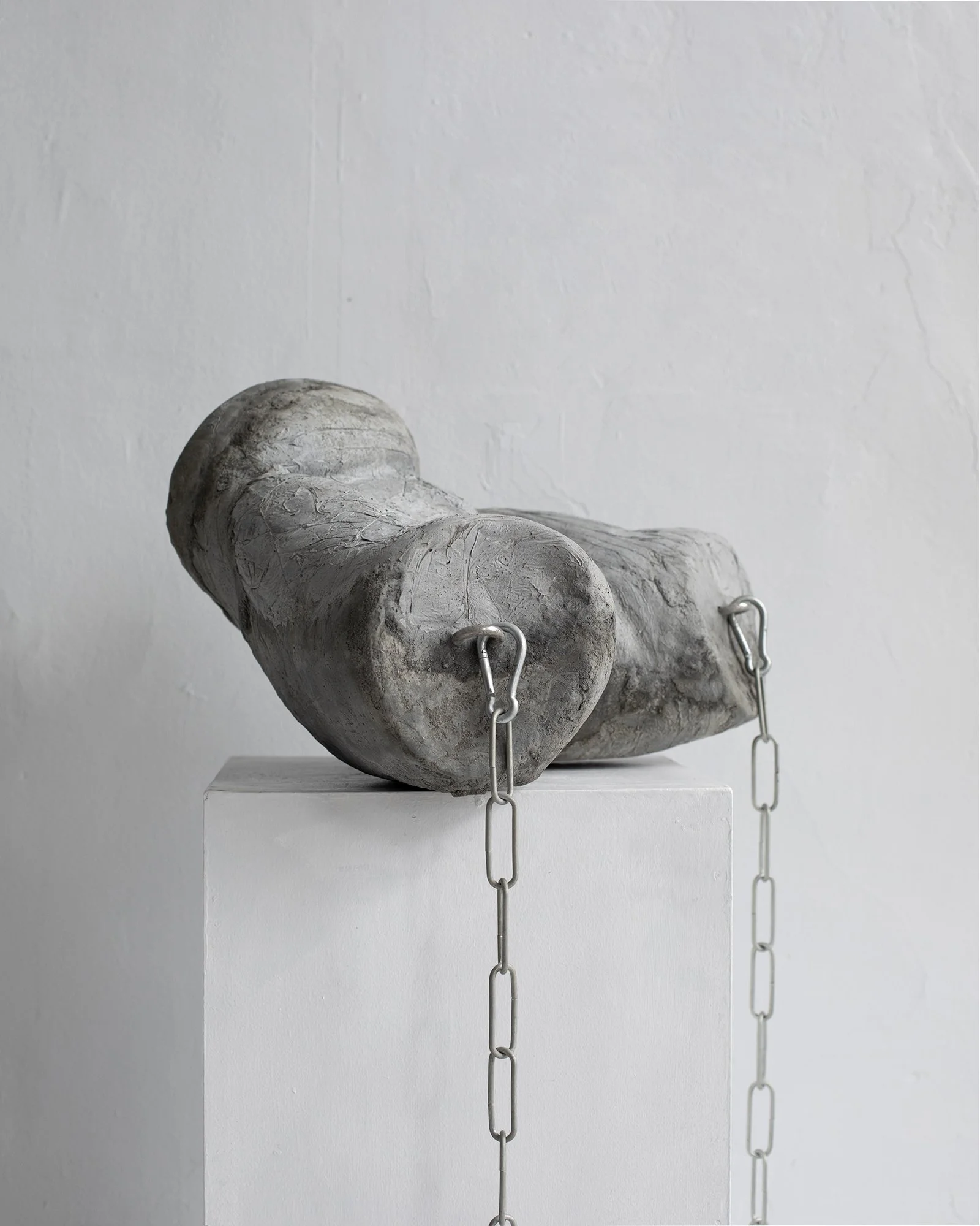 Halvorsen describes her process as one of deliberate opposition, an interplay between control and surrender, sensuality, and restraint. “There has to be a certain tension in my work. Whether that’s incorporating bondage elements into traditional tailoring, or juxtaposing traditionally masculine construction materials like concrete and steel with organically abstract bodies. I’m drawn to the raw feminine, the point where beauty, discomfort, and desire converge.”